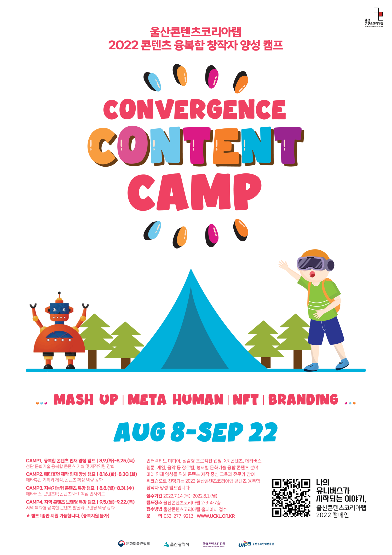 ‘콘텐츠 융복합 창작자 양성 캠프’는 인터렉티브 미디어, 실감형 프로젝션 맵핑, XR 콘텐츠, 메타버스, 웹툰, 게임, 음악 등 장르별, 형태별 문화기술 융합 콘텐츠 분야 미래 인재 양성을 위해 현업 중심의 콘텐츠 기획 및 제작 교육과 전문가 참여 워크숍으로 진행되는 콘텐츠 융복합 창작자 양성 캠프입니다. 울산콘텐츠코리아랩에서만 만나보실 수 있는 ‘콘텐츠 융복합 창작자 양성 캠프’에 여러분의 많은 관심과 참여 부탁드립니다!
