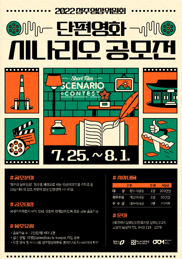 - 2022 청주영상위원회 단편영화 시나리오 공모전이 진행되니 많은 지원과 관심바랍니다.
