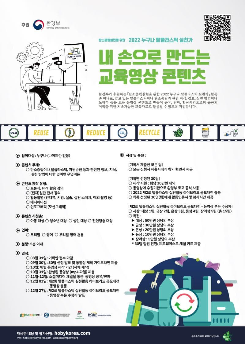 - 환경부 후원 『탄소중립실현을 위한 2022 누구나 탈플라스틱 실천가』 활동 중 하나로, 알고 있는 탈플라스틱이나 탄소중립과 관련 지식, 정보, 실천 방법이나 노하우 등을 교육 동영상 콘텐츠로 만들어 공유, 전파, 확산시킴으로써 공공의 이익을 위한 지속가능한 교육자료로 활용될 수 있도록 지원합니다.