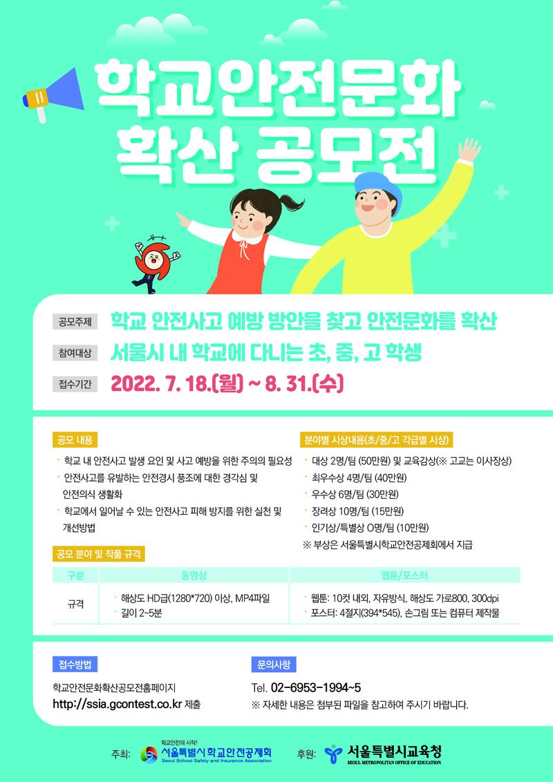 서울특별시학교안전공제회에서는 학교 안전사고의 예방을 위해서 교육수요자인 학생이 주도적으로 현안과 대책을 제시하고 해결방안을 모색하여 안전문화가 확산될 수 있도록 다음과 같이 학교안전문화 확산 공모전을 개최하고자 하오니, 많은 참여 바랍니다.