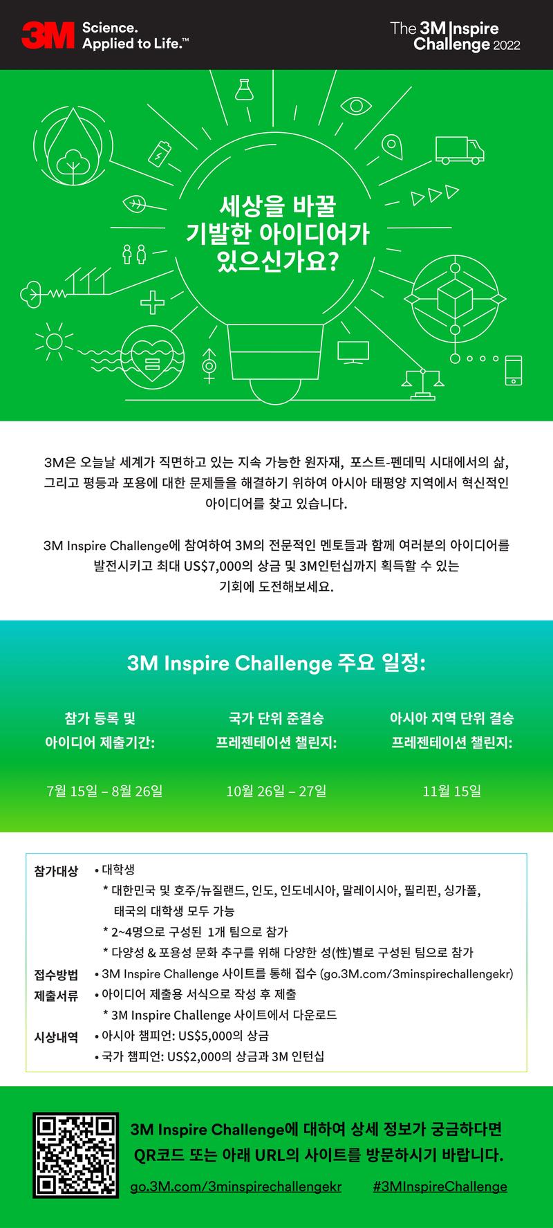 챌린지 참가자 신청과 3M Inspire Challenge의 보다 더 자세한 내용은 웹사이트(https://www.3m.co.kr/3M/ko_KR/company-kr/3M-inspire-challenge/)에서 확인하실 수 있습니다.