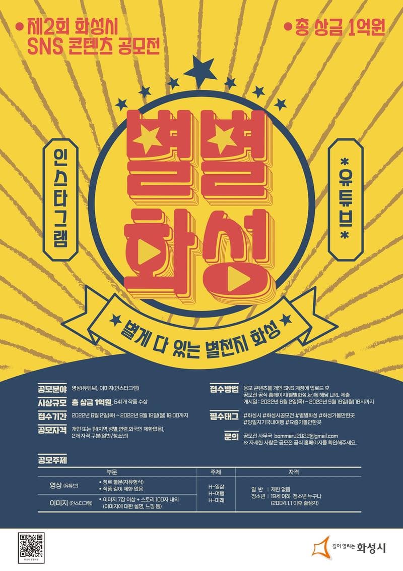 - 이미지 : 응모 콘텐츠를 응모자(팀) 인스타그램(Instagram) 계정에 업로드 후 공모전 홈페이지(별별화성.kr) 접수 양식에 맞춰 제출