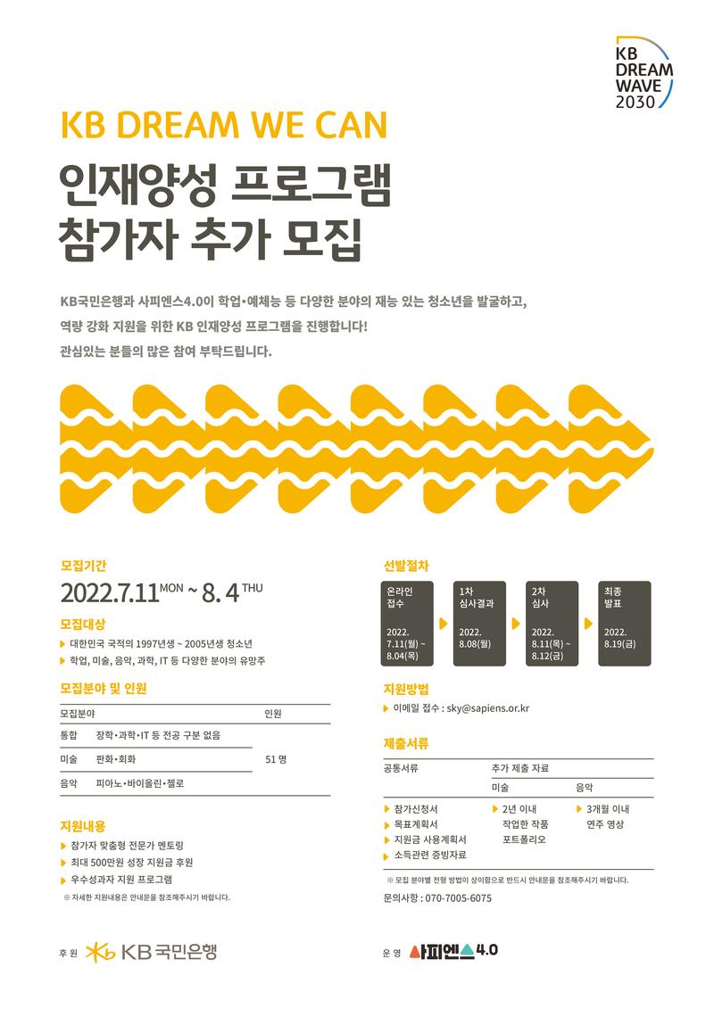 KB국민은행과 사피엔스4.0이 학업, 예체능 등 다양한 분야의 재능있는 청소년을 발굴하고 역량강화 지원을 위한 KB 인재육성 프로그램을 진행합니다.