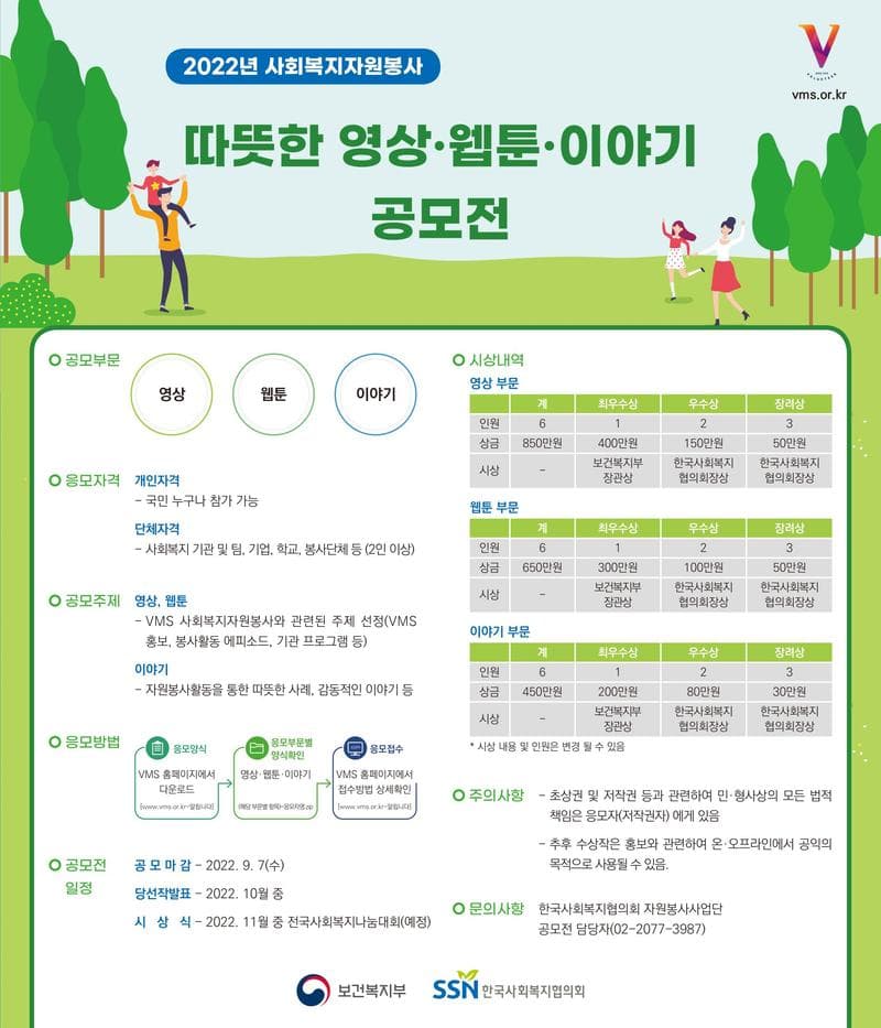 - ☏ 한국사회복지협의회 자원봉사사업단 공모전 담당자(02-2077-3987)