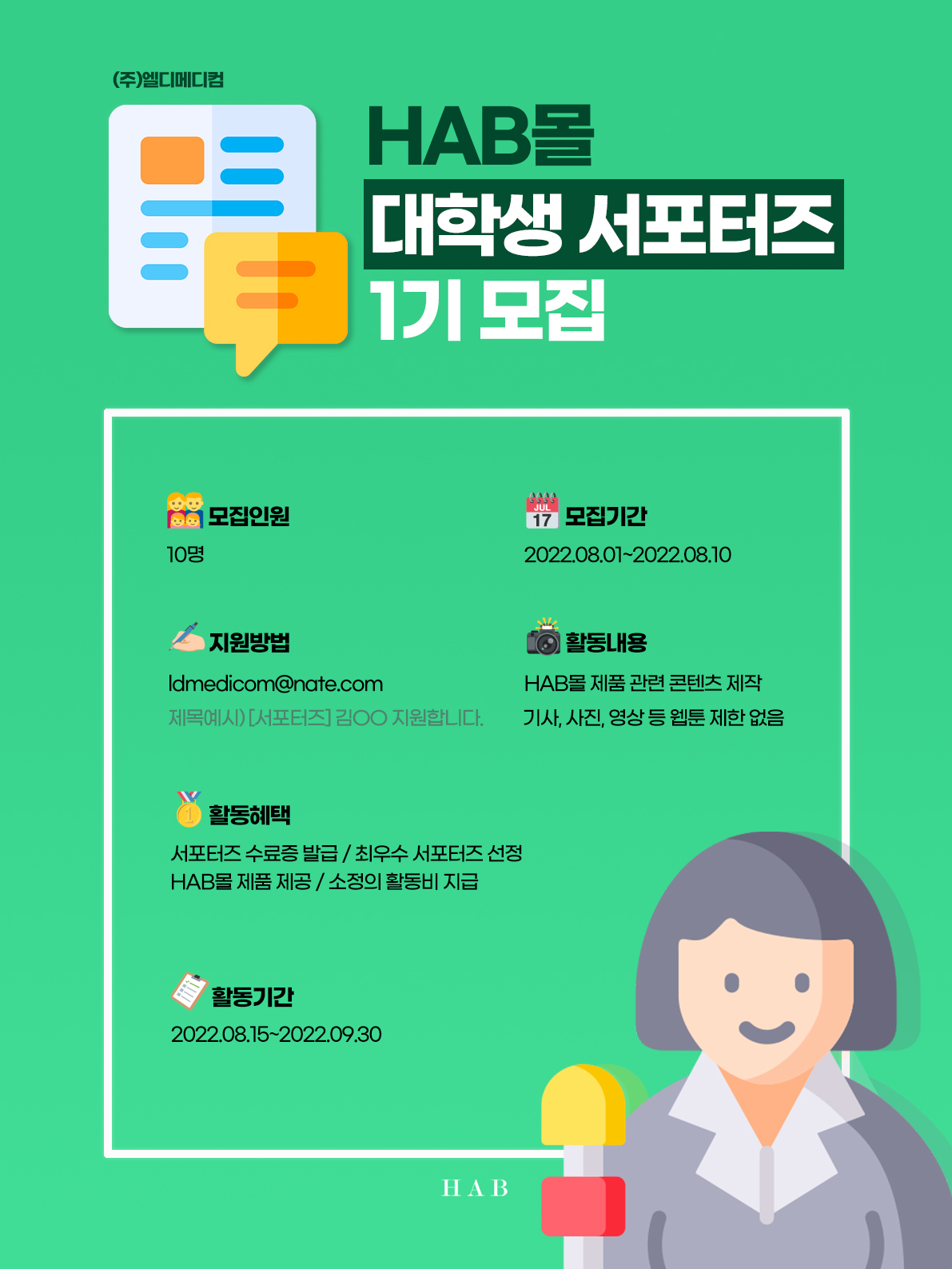 - 건강기능식품 회사 (주)엘디메디컴의 자사몰 HAB몰을 널리 홍보해주실 서포터즈 1기를 모집합니다.
