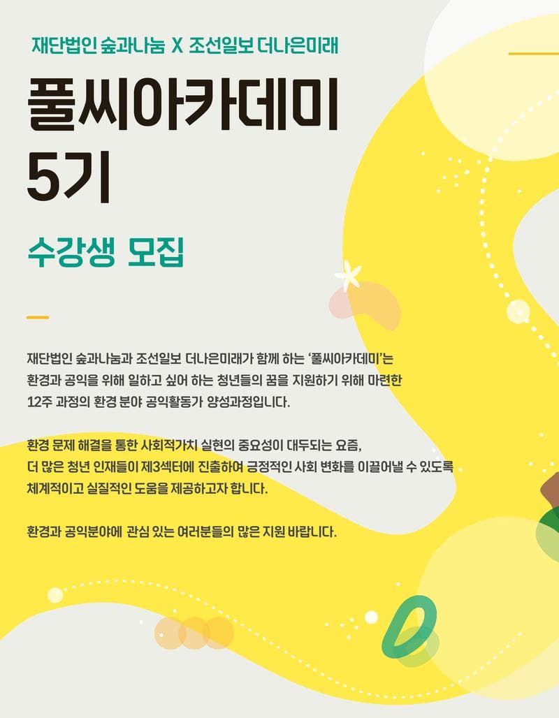 풀씨아카데미는 환경 문제에 관심이 많은 청년들을 공익활동가로 양성하기 위해 마련된 12주 과정의 무료 교육 프로그램으로 환경 분야 전반에 대한 올바른 시선과 높은 이해도를 갖춘 청년인재를 양성하여 미래의 환경 분야 공익 활동가를 육성하는 것이 프로그램의 목표입니다.