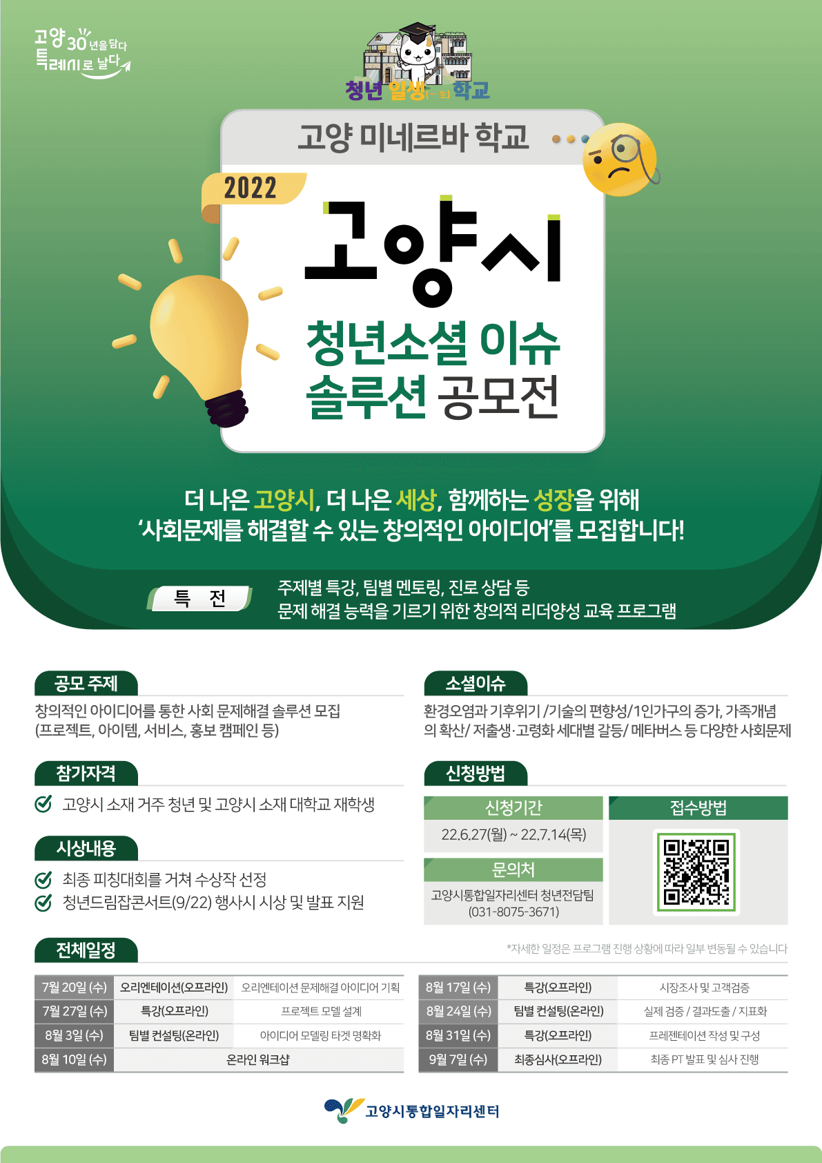 고양시 청년들의 자기 주도적 문제해결 능력 향상을 통한 창의적 인재 양성을 목표로 하는 고양시 청년 소셜 이슈 솔루션 공모전을 개최하오니 많은 관심 부탁드립니다 :)