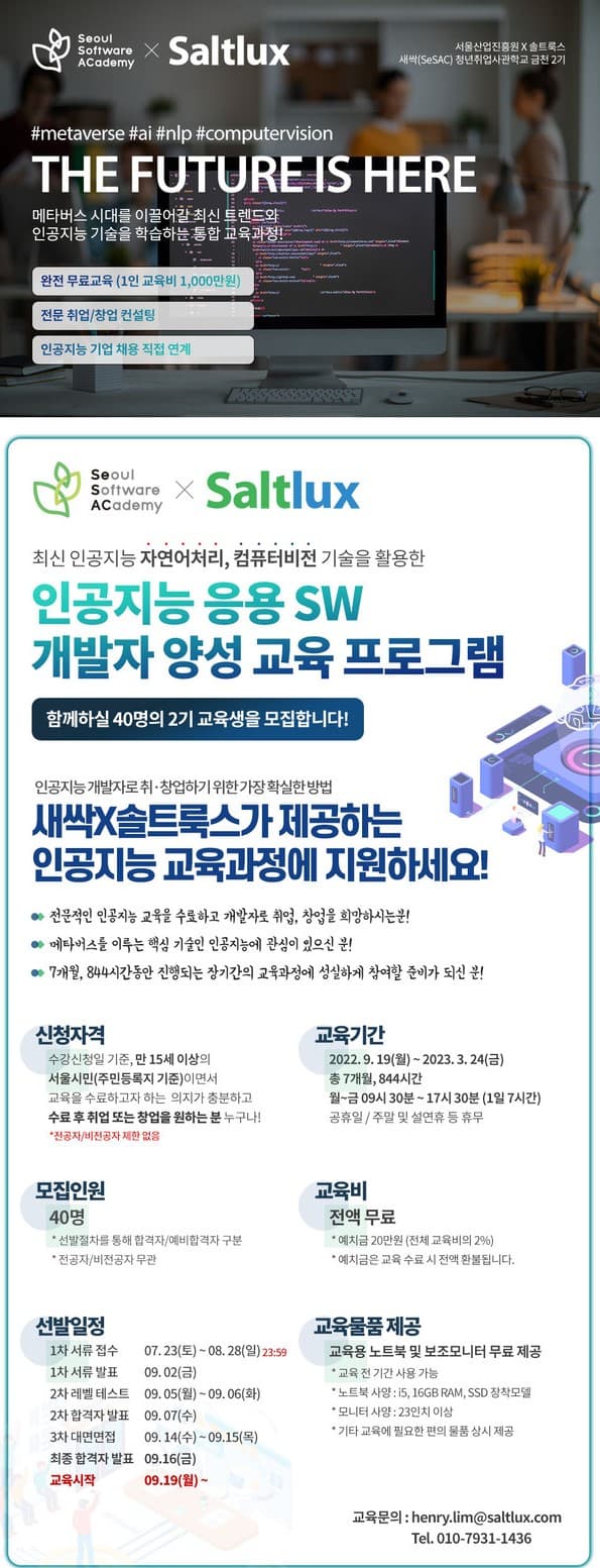 전년도 인공지능 과정을 성공적으로 운영한 솔트룩스에서 다시 준비하여 제공하는 과정입니다.