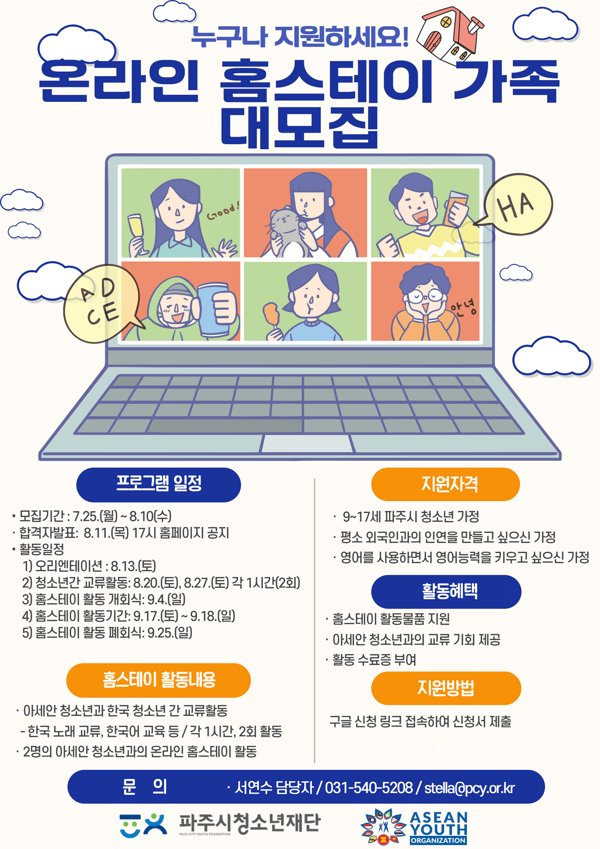- 9~17세 파주시 청소년 가정(8.20.토, 8.27.토 1시간 아세안 청소년과의 교류활동이 가능한 파주시청소년 환영!)