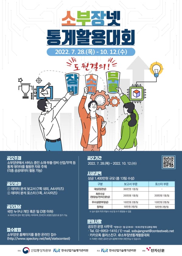- 소부장넷 통계활용대회 홈페이지(http://www.spectory.net/keit/statscontest/)에서 신청 양식 작성 및 작품 제출