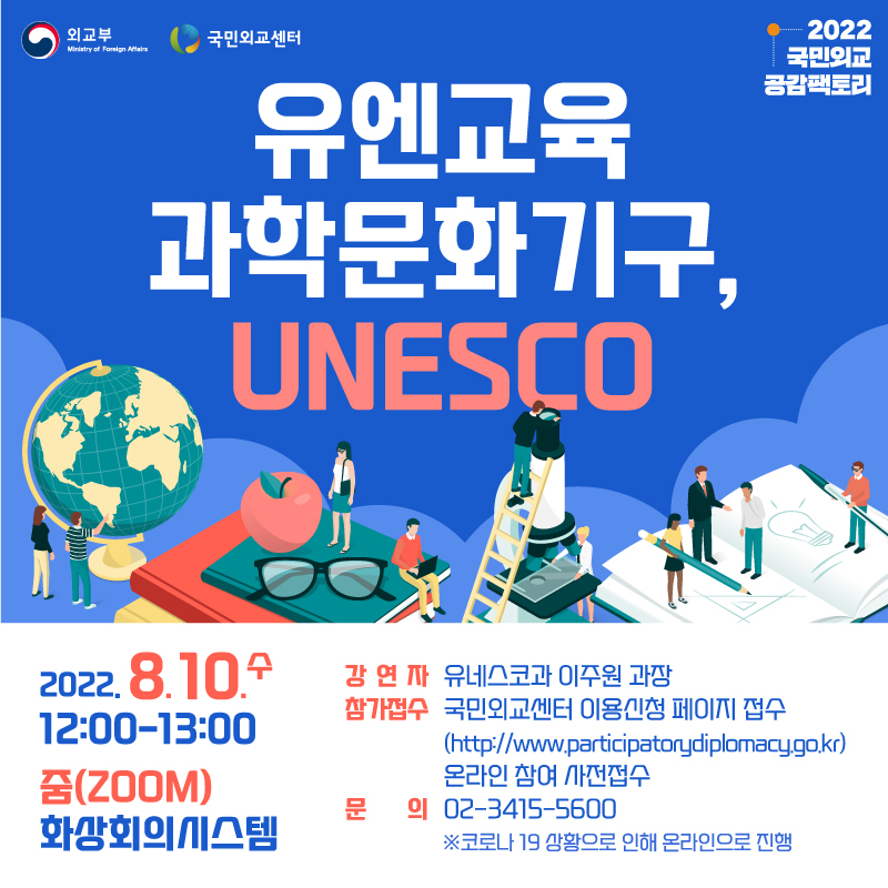 외교부는 8월 10일(수) 12:00-13:00 “유엔교육과학문화기구:UNESCO"를 주제로 국민외교 공감팩토리를 개최할 예정입니다.