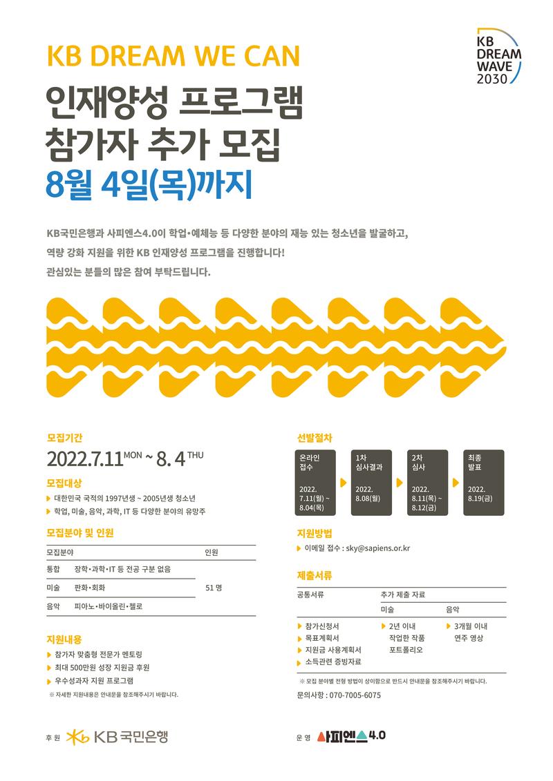 KB국민은행과 사피엔스4.0은 학업, 예체능 등 다양한 분야의 재능있는 청소년을 발굴을 위해