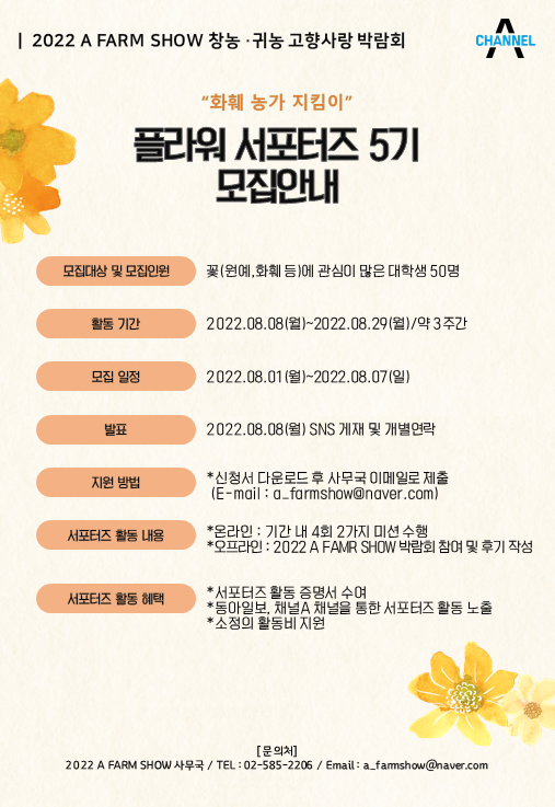 ▶[동아일보, 채널A] 2022 A FARM SHOW 화훼 농가 지킴이 대학생 ‘플라워 서포터즈’ 5기 모집