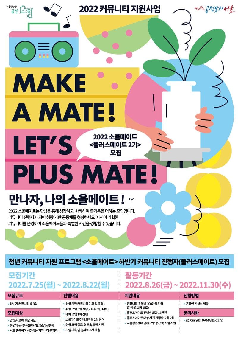 청년들의 공동 성장과 상호 발전을 지원하는 서울청년센터 금천 오랑의 커뮤니티 지원사업 <소울메이트>의 하반기 커뮤니티를 이끌어갈 플러스메이트 2기를 모집합니다!