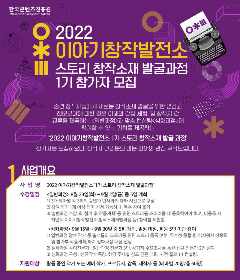 한국콘텐츠진흥원 2022 이야기창작발전소 ‘스토리 창작소재 발굴과정’ 1기 참가자 모집