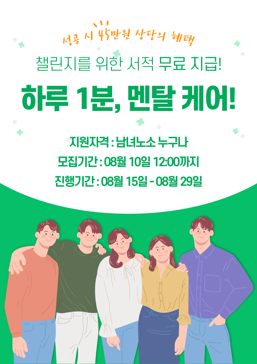※ 챌린지에 참여 시 챌린지 진행에 필요한 [1분 멘탈 케어] 서적이 무료 제공 (배송비 무료)