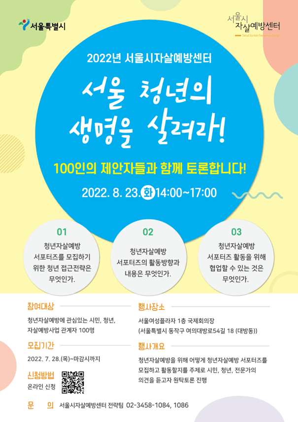 서울시자살예방센터에서는 청년자살예방 서포터즈(가칭)을 조직하고 운영하기 위해 서울시민과 전문가와 함께 100인 토론회를 진행하고자 합니다. 많은 관심과 참여 부탁드립니다.