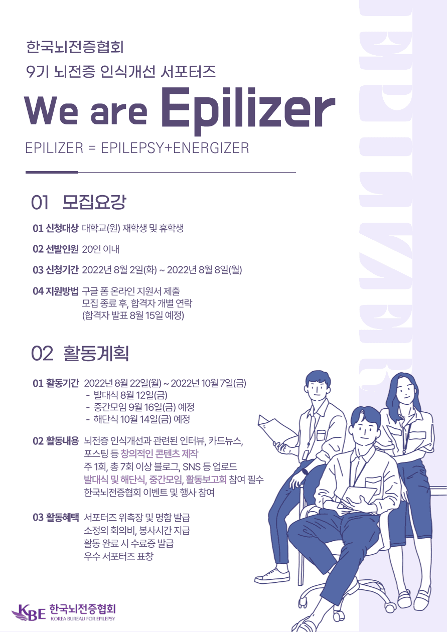 한국뇌전증협회에서 뇌전증에 대해 함께 알아가며, 부정적인 사회 인식을 개선해나갈 제9기 서포터즈 “We are Epilizer”를 다음과 같이 모집하오니 많은 참여 바랍니다.