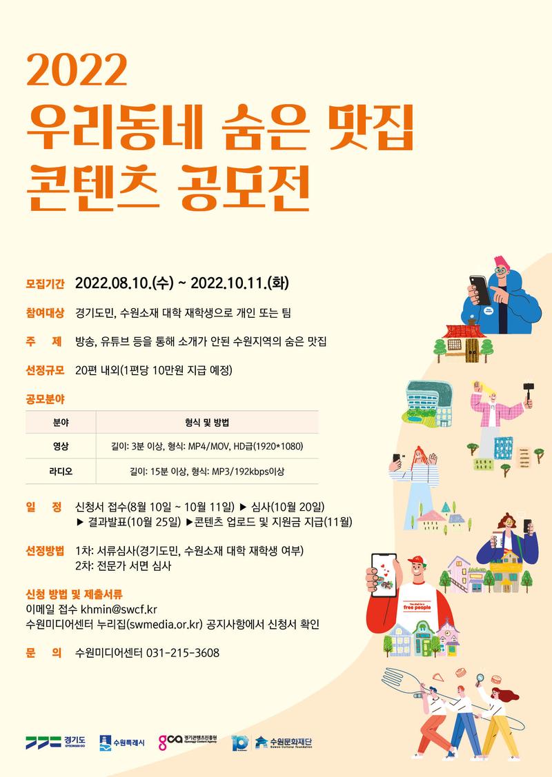 수원미디어센터는 경기도, 경기콘텐츠진흥원과 함께「시민 콘텐츠 제작 활성화」사업을 진행합니다. 지역 상권과 상생하고 지역 사회에 기여하는 미디어 문화 형성을 위해《2022 우리동네 숨은 맛집 콘텐츠 공모전》을 아래와 같이 진행하오니, 시민 여러분의 많은 참여 바랍니다.