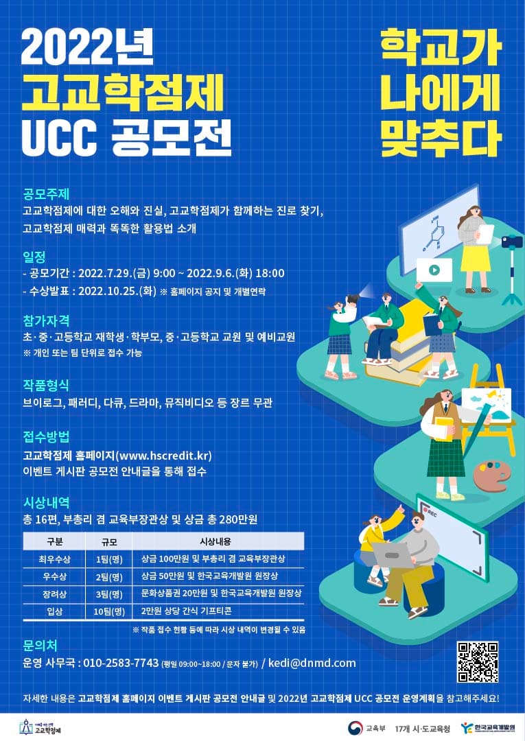 교육부와 한국교육개발원에서는 2025년 고교학점제의 본격 시행을 준비하며, 고교학점제에 대한 학생, 교사, 학부모님들의 생각을 공유하고 우수한 사례를 확산하고자 ‘2022년 고교학점제 UCC 공모전’을 개최합니다.
