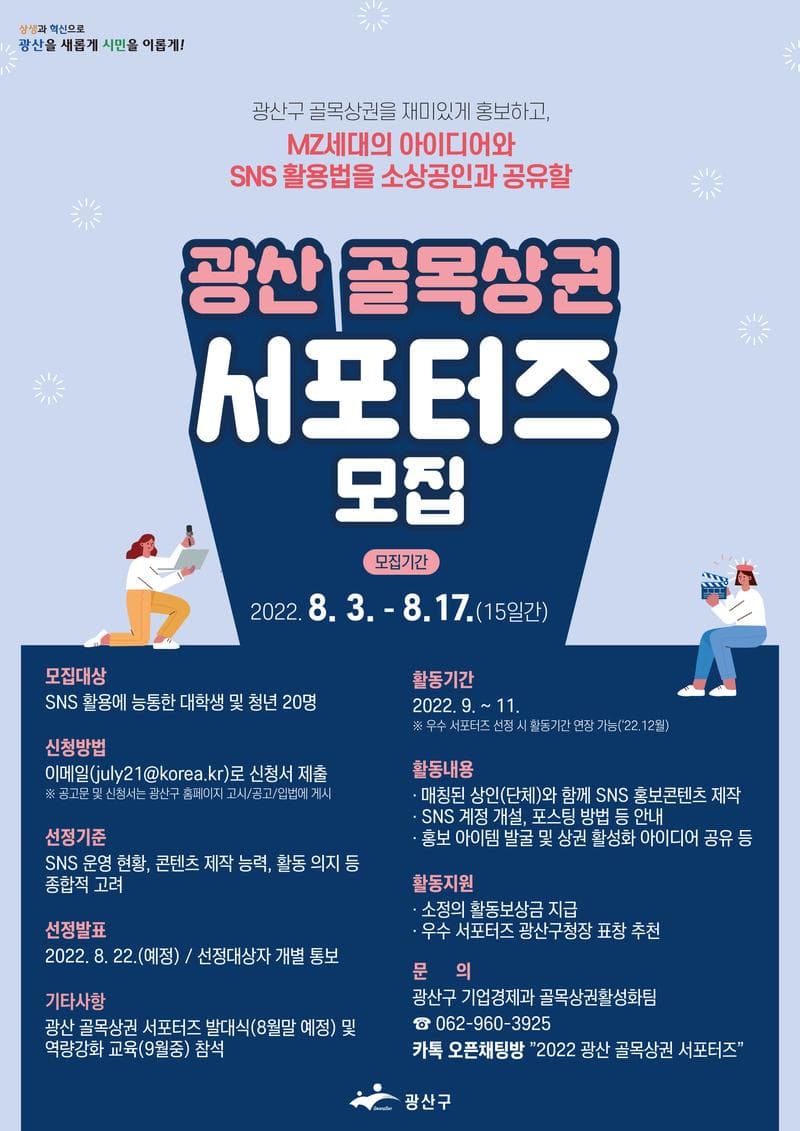 - 광산구청 홈페이지 → 뉴스소식 → 고시/공고/입법 → 2022년 광산 골목상권 서포터즈 모집 공고