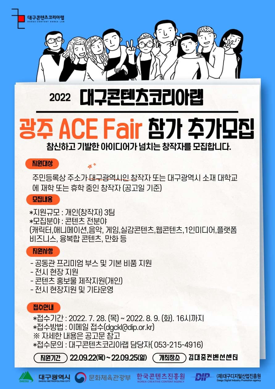 대구콘텐츠코리아랩의 일환으로 추진중인 광주 ACE FAIR 참가 모집을 공고합니다.