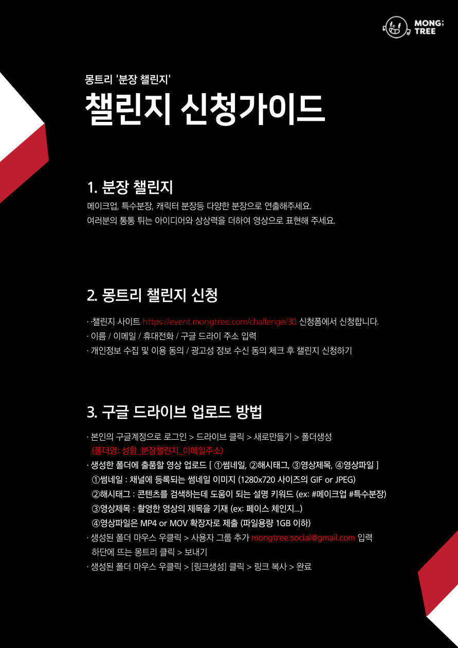 ex) 홍길동_분장챌린지_mongtree.social@gmail.com