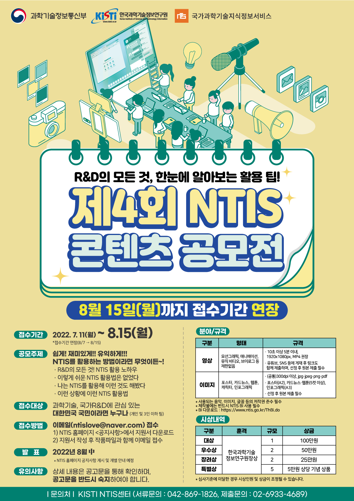 - 공모주제 : R&D의 모든 것!, NTIS 이용 노하우, 이렇게 쉬운 NTIS 이용법은 없다!, NTIS를 이용하고 싶게 만드는 신박하고 창의적인 홍보 콘텐츠 등 NTIS와 관련된 모든 주제