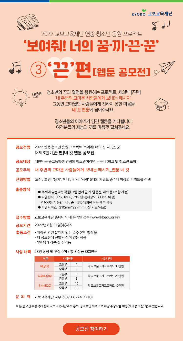 ※ 본 공모전 수상작에 한해 교보교육재단 홍보, 공익적인 목적으로 해당 수상작을 이용 (재가공 포함) 할 수 있습니다.