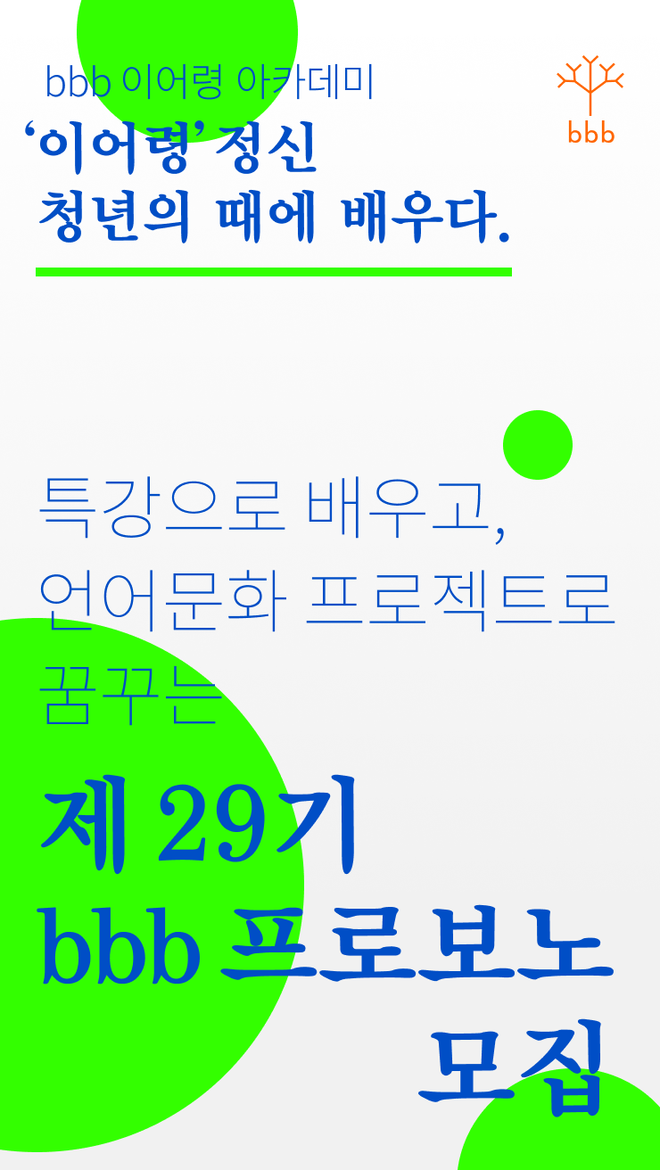 bbb 프로보노는 재능나눔을 기반으로 팀별로 기획한 프로젝트를 실행하며 언어·문화 장벽 없는 소통의 세상 만들기 - bbb 운동의 가치 확산에 동참하는 bbb 코리아 대학생 봉사단입니다. 2006년 1기를 시작으로 2022년 28기까지 총 379명의 대학생이 활동했습니다. 제29기 bbb 프로보노는 bbb 창안자 이어령 정신이 녹아있는 팀별 프로젝트를 기획하며 수행하게 됩니다. 또한, 인문학 특강을 들으며 언어문화 장벽을 극복하는 가치에 대해 고민하고 나눌 수 있습니다.