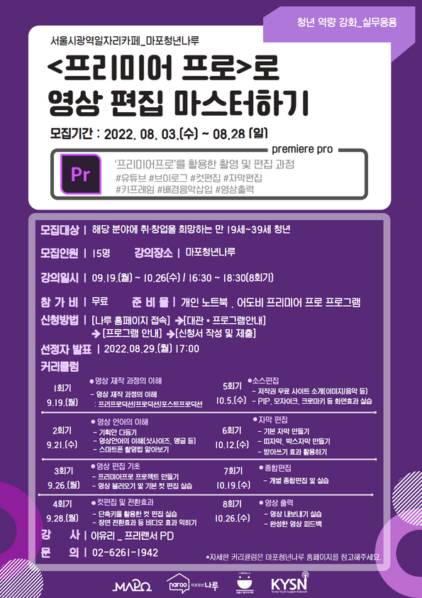 #마포청년나루 #청년공간 #마포구 #상수역 #광흥창역 #취업특강 #창업특강 #취창업프로그램 #무료프로그램 #영상편집 #프리미어프로#영상제작 #유튜브 #브이로그