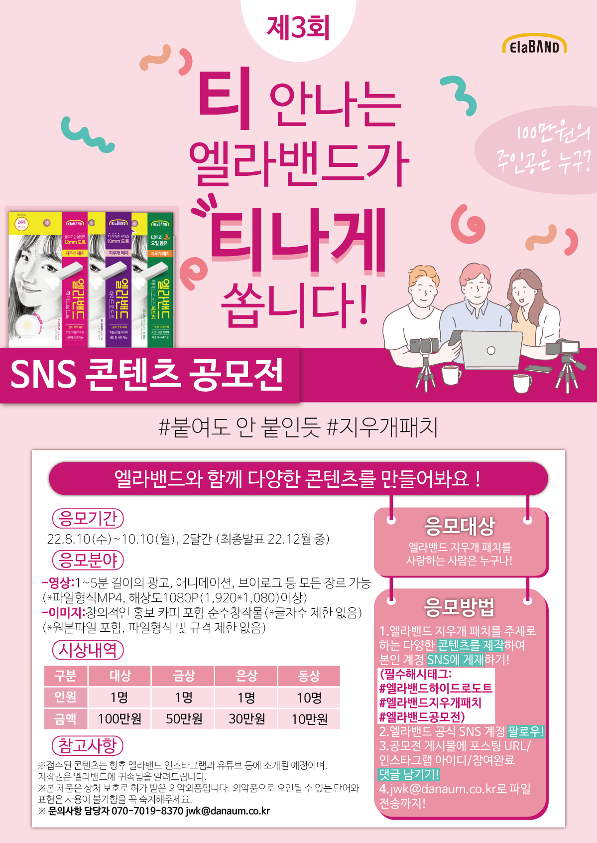 엘라밴드 홍보담당관 SNS 콘텐츠 공모전 담당자( 070-7019-8370 jwk@danaum.co.kr )