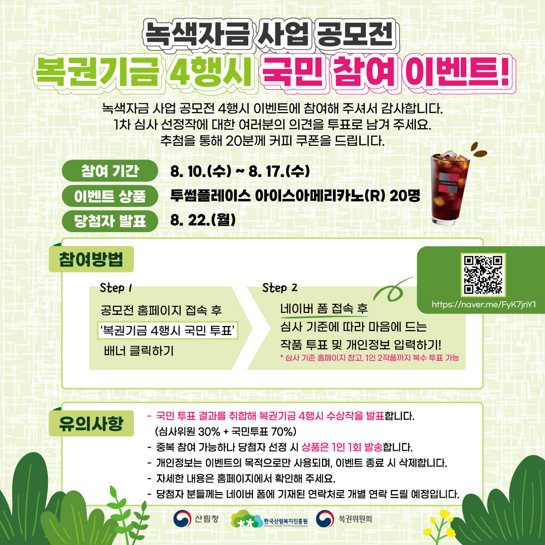 [한국산림복지진흥원] 녹색자금 사업 공모전 복권기금 4행시 이벤트 국민 투표 이벤트(~8/17)
