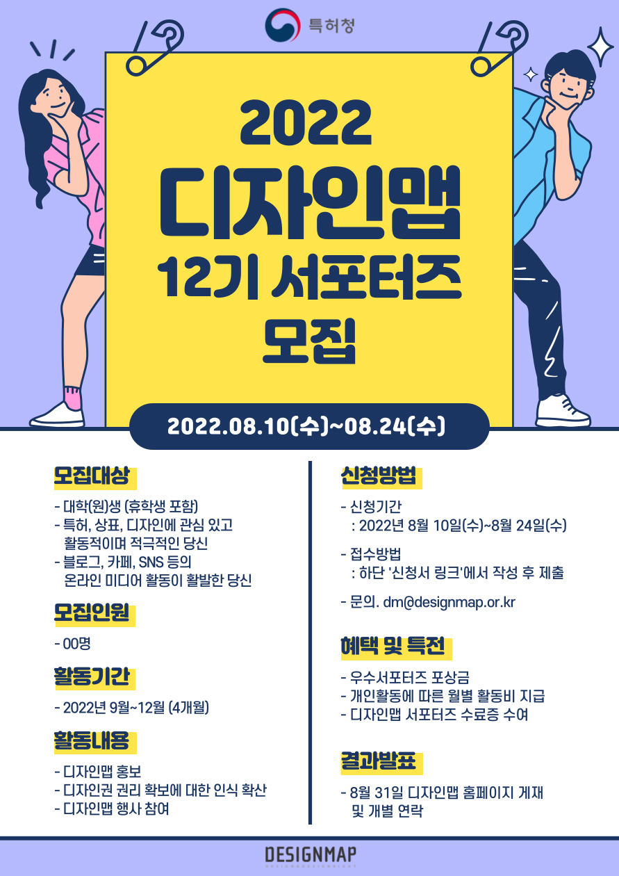 특허청 디자인맵에서는 디자인권의 중요성에 대한 인식 재고를 위해 제12기 디자인맵 서포터즈를 모집합니다.