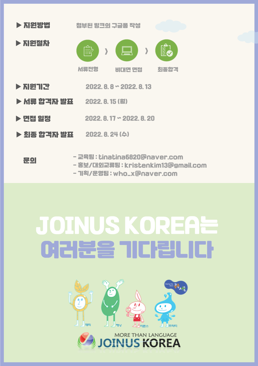 o 추가 접수 일정: 2022년 08월 08일(월) ~ 2022년 08월 13일(토) o 서류 결과 발표: 2022년 08월 15일(월) o 비대면 면접 진행: 2022년 08월 17일(수) ~ 2022년 08월 20일(토) o 최종 합격자 발표: 2022년 08월 24일(수) | |||