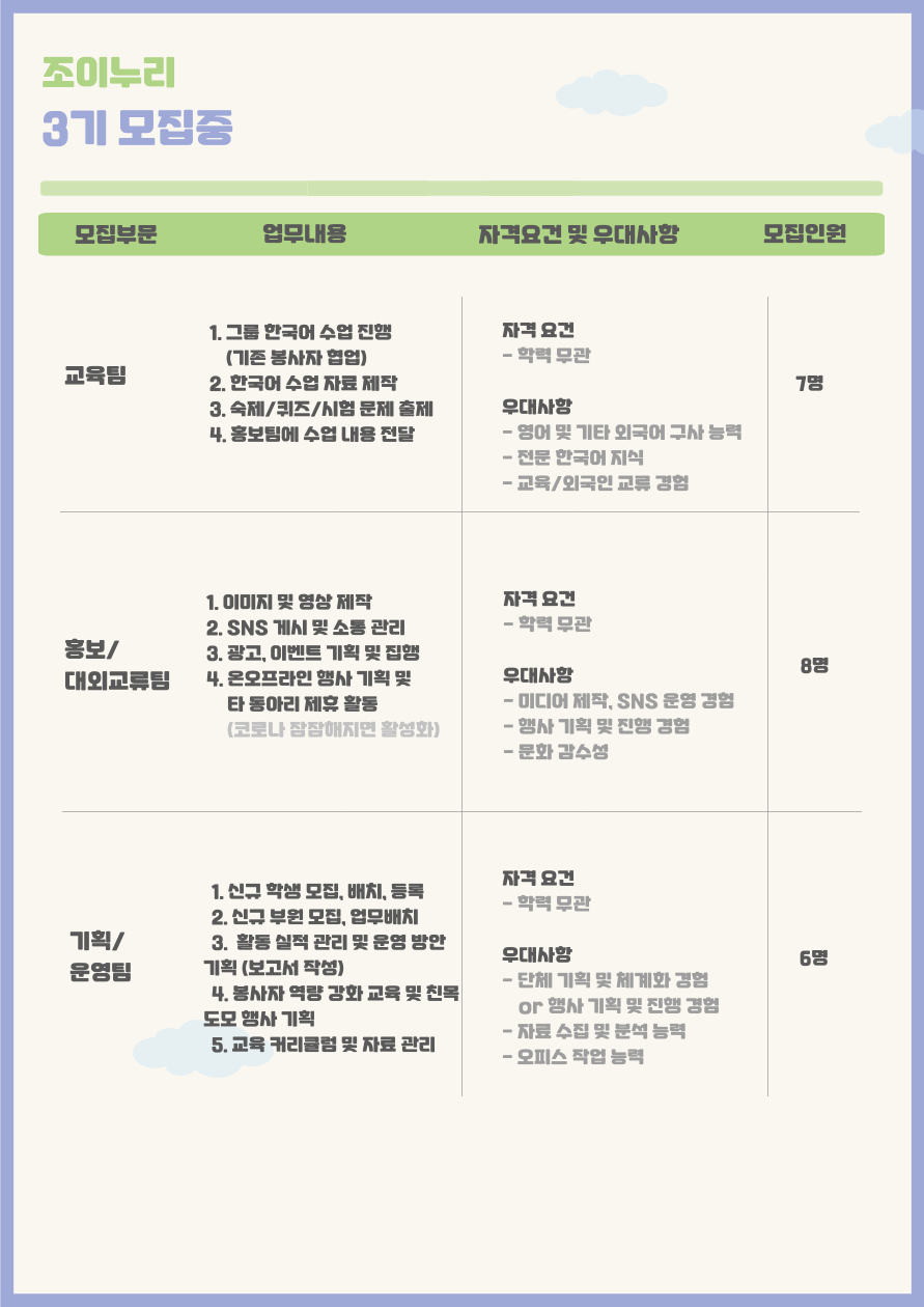 o 3기: 2022.09.01 (수) ~ 2023.02.28 (화) * 6개월 단위 기수별 활동이 원칙이지만, 희망 시 최대 2개 기수까지 연장 가능함 (최대 활동 기간 1년 6개월) *코로나로 인해 3기 부원은 활동이 비대면으로 진행될 수도 있음 *추후 코로나 종식 후 대면 활동이 활성화되면 홍보팀과 대외교류팀 분리할 예정 | |||