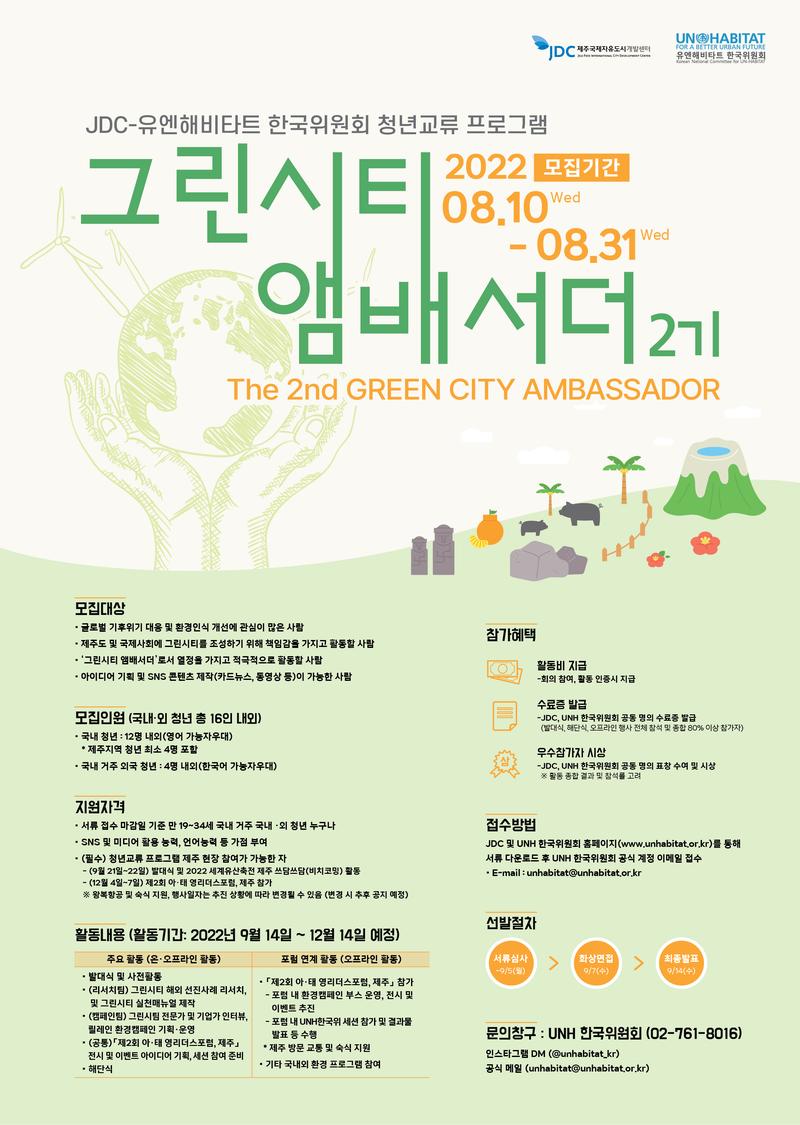 - 제주국제자유도시개발센터(JDC)와 유엔해비타트 한국위원회(UNH 한국위)의 협력을 통해 지속가능한 제주의 도시·환경 발전을 위한 모델을 제시함과 동시에 글로벌 환경 인재를 육성하고 지원하기 위한 프로그램입니다. 서포터즈 활동과 더불어 「제2회 아·태 영리더스포럼, 제주」*와 연계하여 세계 청년 영리더들과의 교류를 통해 다양한 기회와 아이디어를 공유할 수 있는 기회를 제공하고자 합니다.