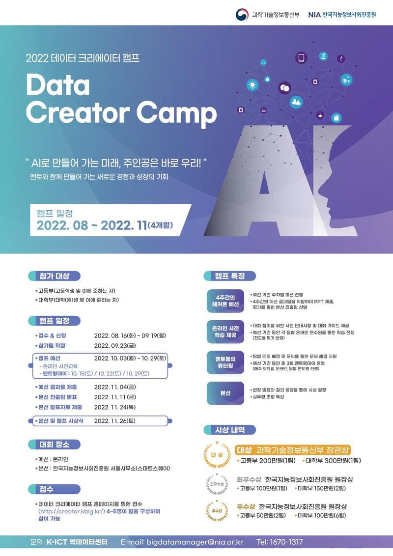 대상으로 10월 3일부터 11월 26일 까지 2022 데이터 크리에이터 캠프를 개최합니다.
