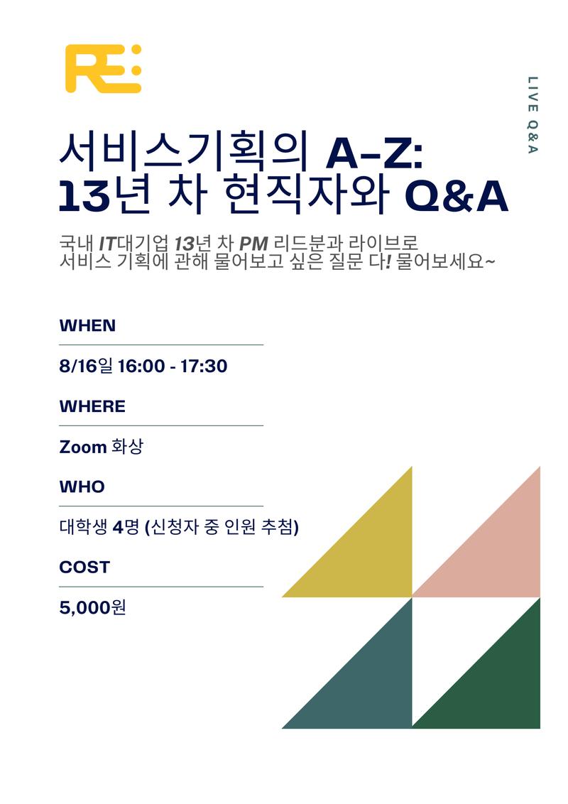 서비스 기획(프로덕트 매니지먼트)에 관심이 있는 대학생들의 직무 이해도를 높이기 위한 13년 차 PM이랑 진행하는 라이브, 쌍방향 Q&A 세션. 참여자는 Q&A 동안 자유롭게 원하는 질문을 하고, 대답 받을 수 있습니다.