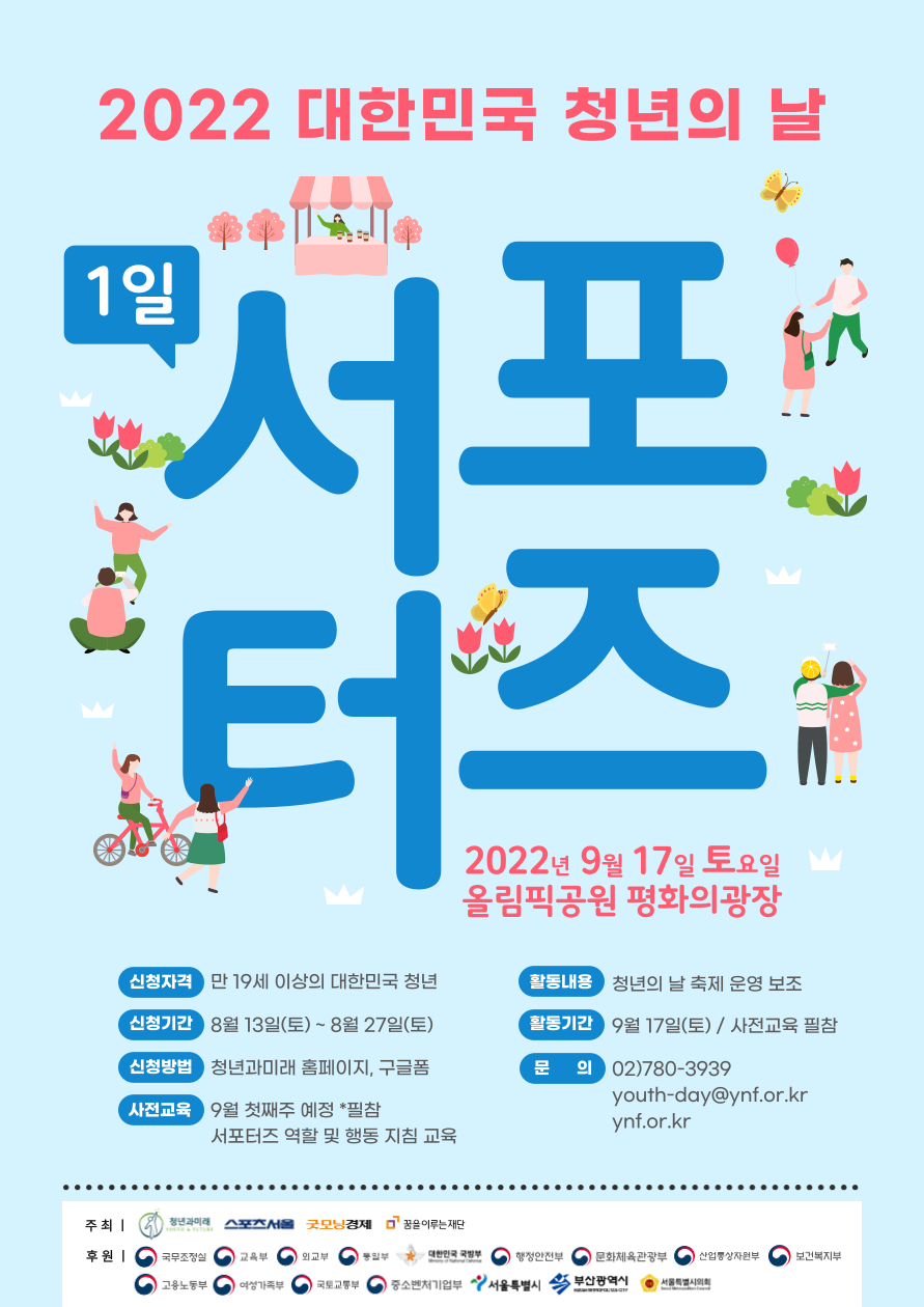 대한민국 청년들이 직접 기획하고 참여하는 참여형 종합축제🎊 이번 청년의 날을 서포트해주실 1일 서포터즈를 모집합니다!