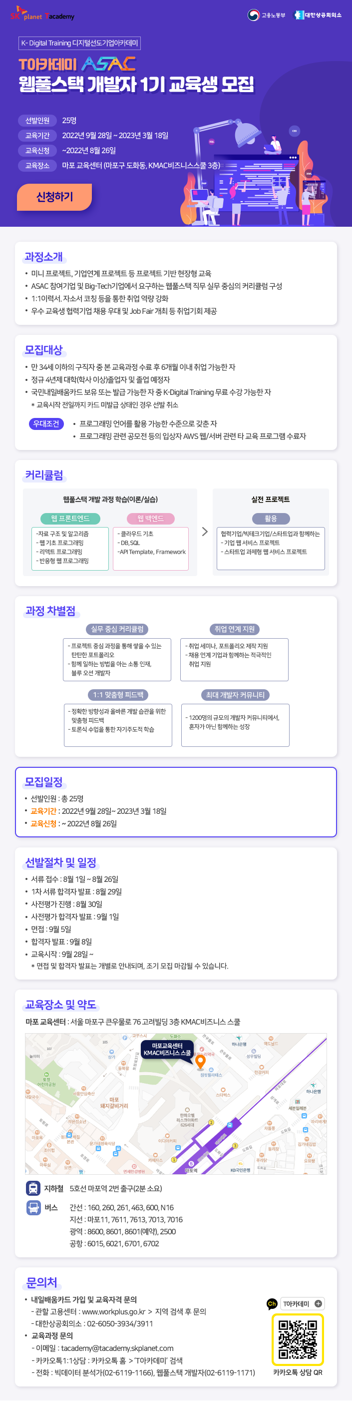 - 오프라인 수업 : 마포 교육센터, 마포구 도화동, KMAC비즈니스스쿨 3층 9 to 6 오프라인 상주 진행