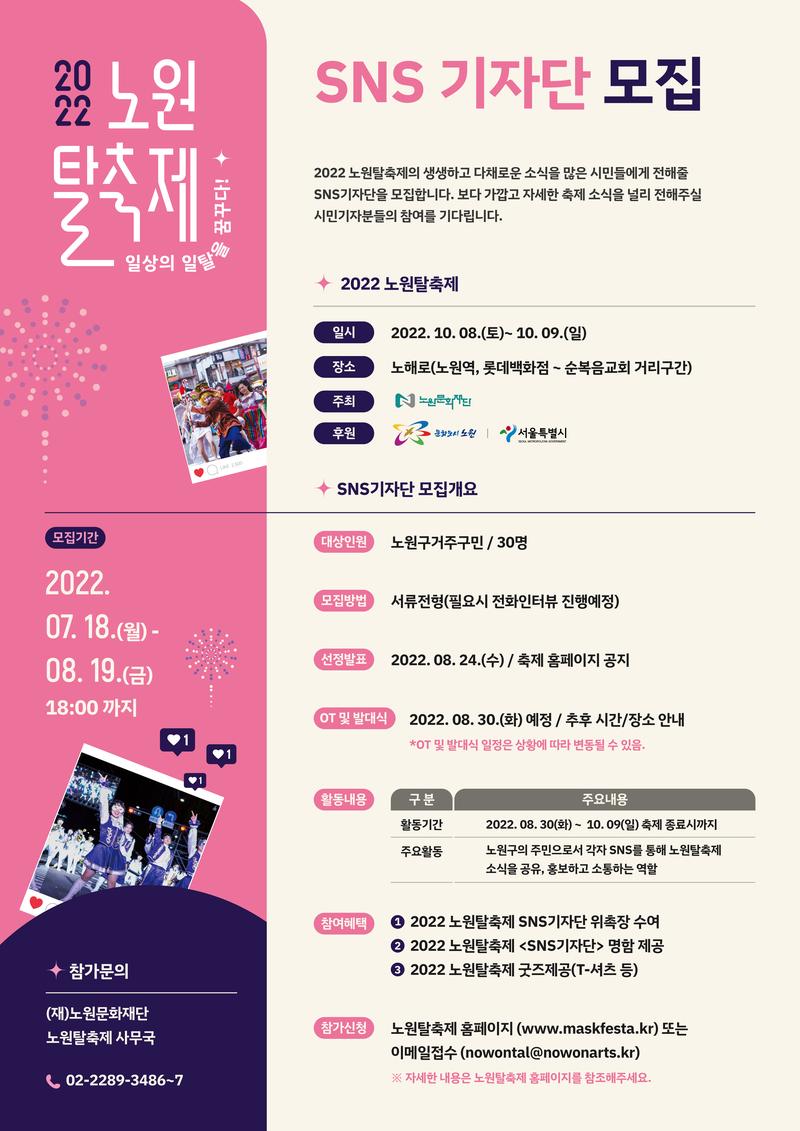 2022 노원탈축제의 생생하고 다채로운 소식을 많은 시민들에게 전해줄 SNS기자단을 모집하오니, 많은 분들의 관심과 참여를 부탁드립니다.