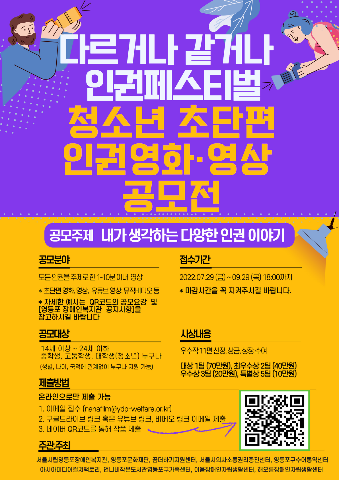 7. 접수방법: nanafilm@ydp-welfare.or.kr 이메일 접수 또는 비메오 또는 유튜브 링크 또는 QR코드접속을 통한 제출