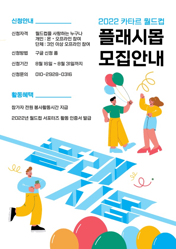 2022 카타르 월드컵을 맞이해 온라인 홍보 서포터즈에 이어 온라인, 오프라인 플래시몹 서포터즈를 모집합니다! 새로운 월드컵 서포터즈님들과의 소중한 만남을 기다릴게요 ❤️