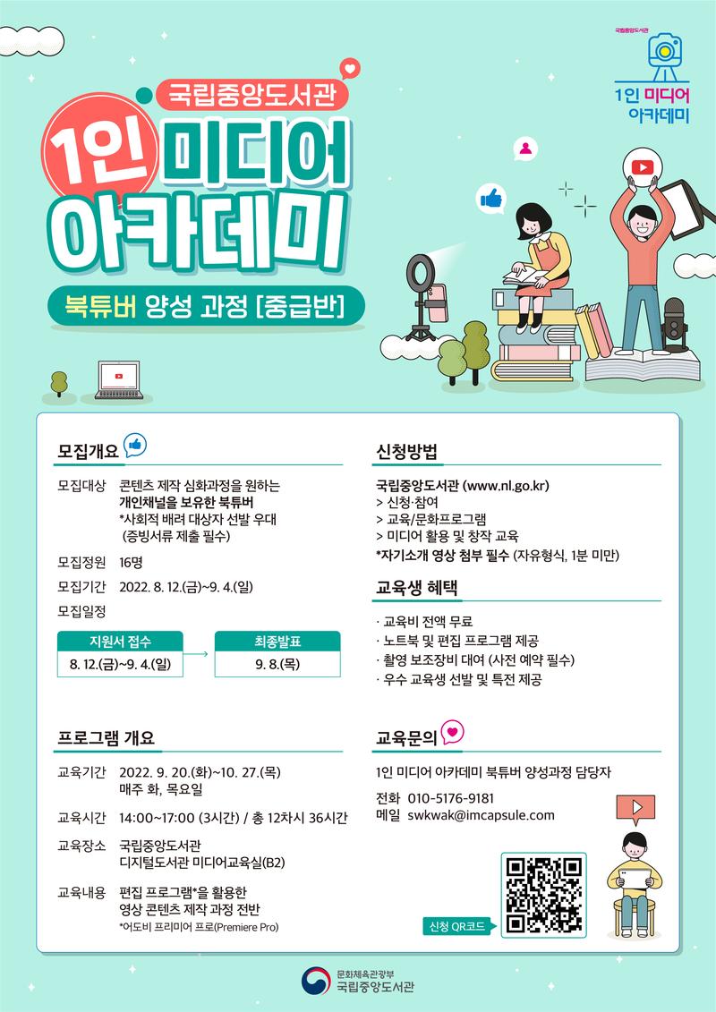 국립중앙도서관에서 재능 있는 크리에이터들을 발굴하고자 '2022 1인 미디어 아카데미'를 운영합니다.