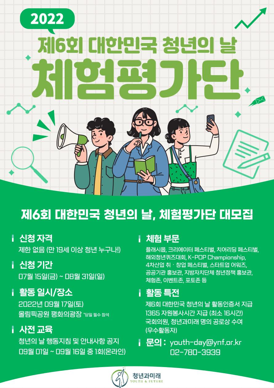 대한민국 청년들이 직접 기획하고 참여하는 참여형 종합축제✨ 이번 청년의 날을 평가해주실 체험평가단 여러분을 모집합니다!