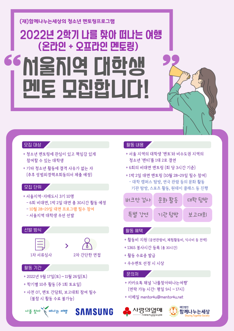 - 청소년 멘토링에 관심이 있고 책임감 있게 참여할 수 있는 대학생