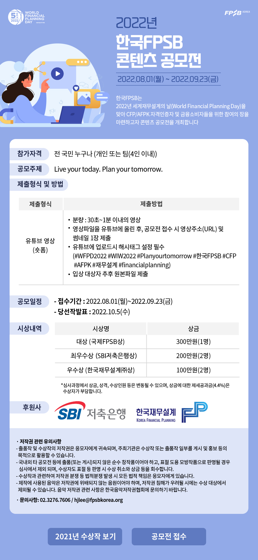 한국FPSB는 2022년 세계재무설계의 날(World Financial Planning Day)을 맞아 CFP/AFPK 자격인증자 및 금융소비자들을 위한 참여의 장을 마련하고자 콘텐츠 공모전을 개최합니다.