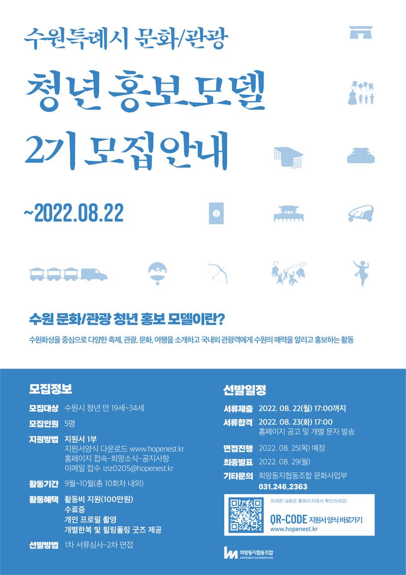 - 수원시 내 청년(만 19세~34세)을 대상으로 관광활성화를 통한 청년 홍보모델 양성 및 문화관광 콘텐츠 활성화