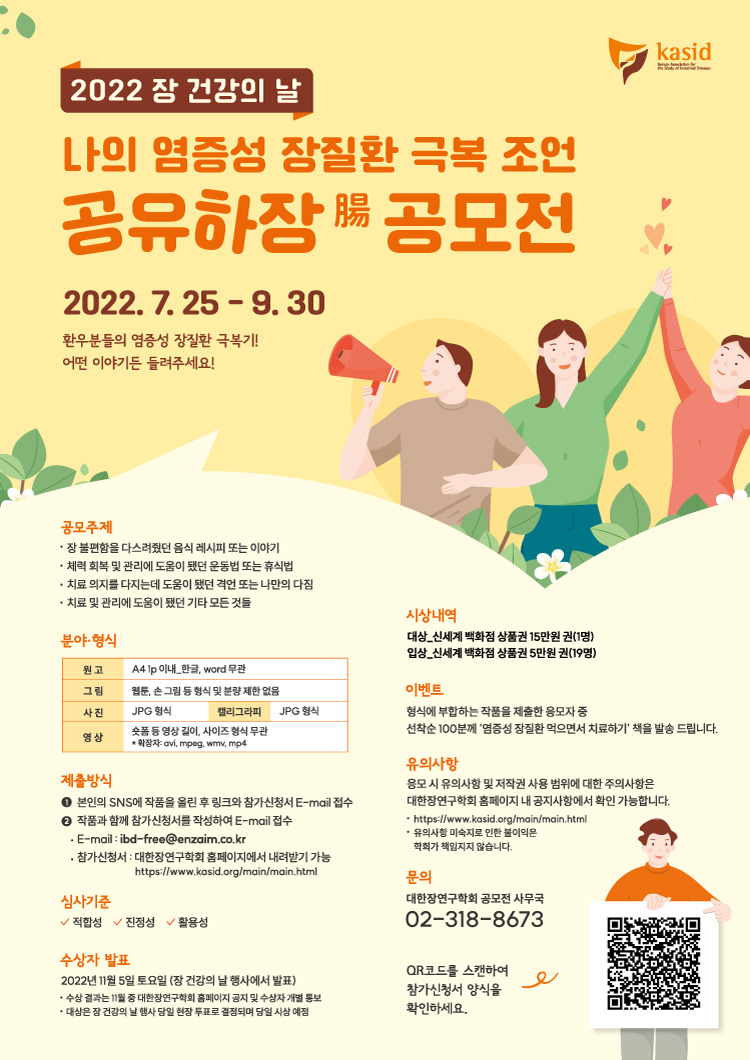 - 2022 장 건강의 날을 맞아 대한장연구학회에서 '나의 염증성 장질환 극복 조언 공유하장 공모전'을 진행합니다.